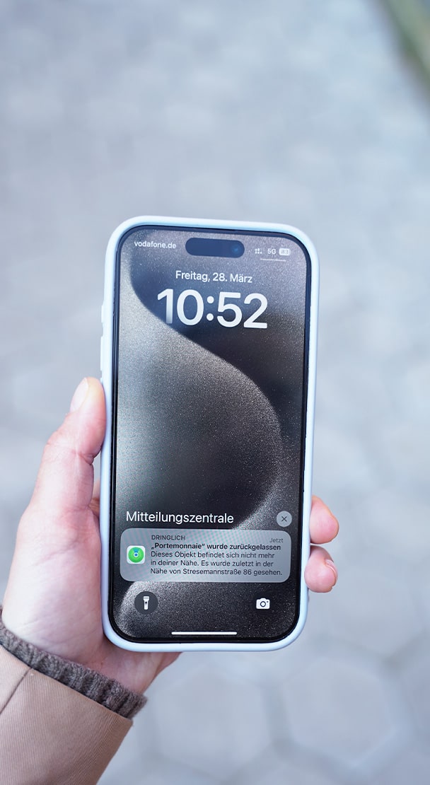 Sie hilft dir, deine Geldbörse jederzeit einfach über die Apple „Wo ist?“-App bzw. Google "Mein Gerät finden"-App. Damit gehört die panische Suche nach dem Portemonnaie der Vergangenheit an.