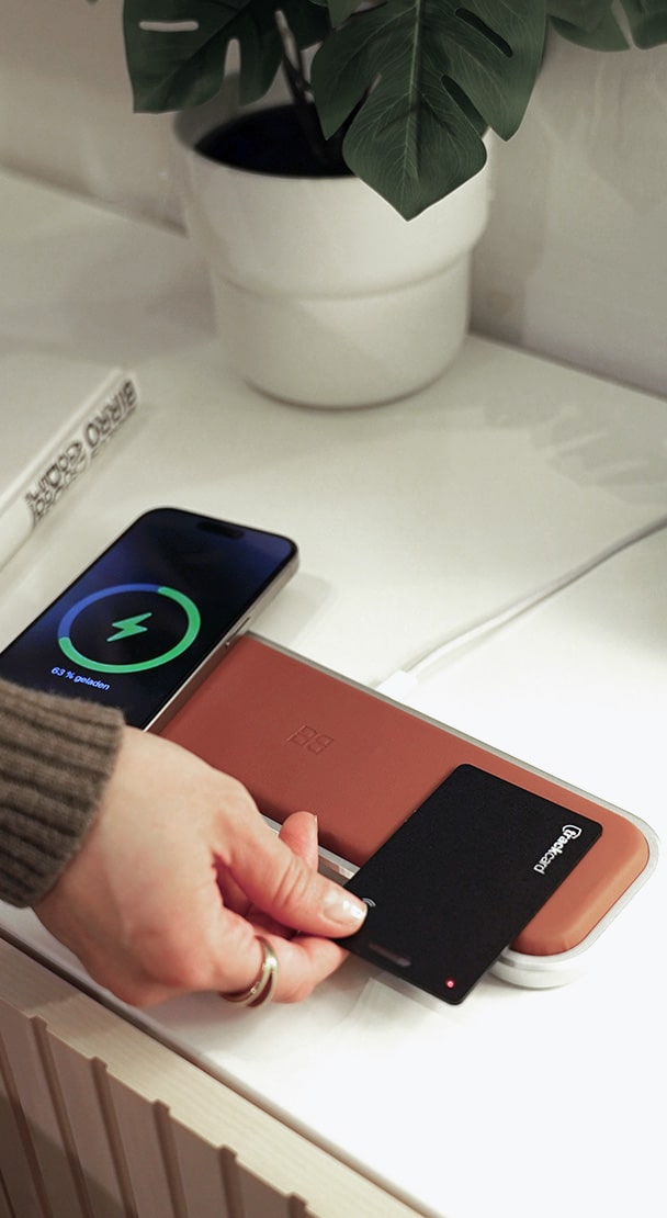 Wenn es so weit ist, legst du die Trackcard einfach auf ein gängiges kabelloses Ladegerät (wie du es vielleicht schon für dein Handy nutzt) und in weniger als zwei Stunden ist sie wieder voll einsatzbereit.